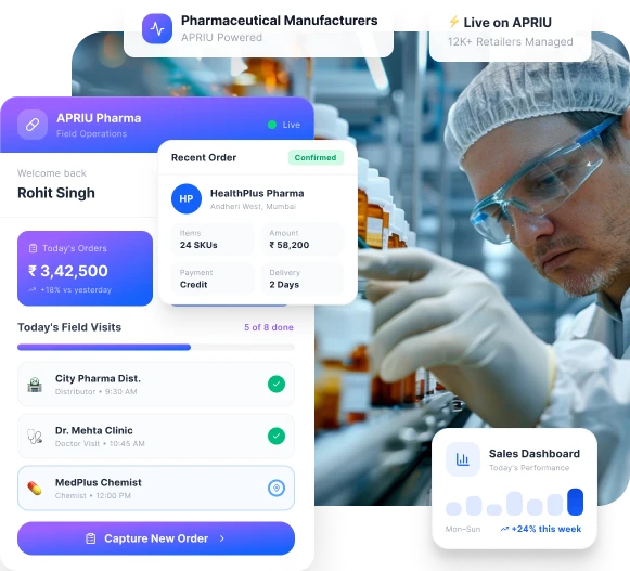 APRIU helps pharma manufacturers manage field teams, track distributor activity, capture orders, and monitor sales performance.